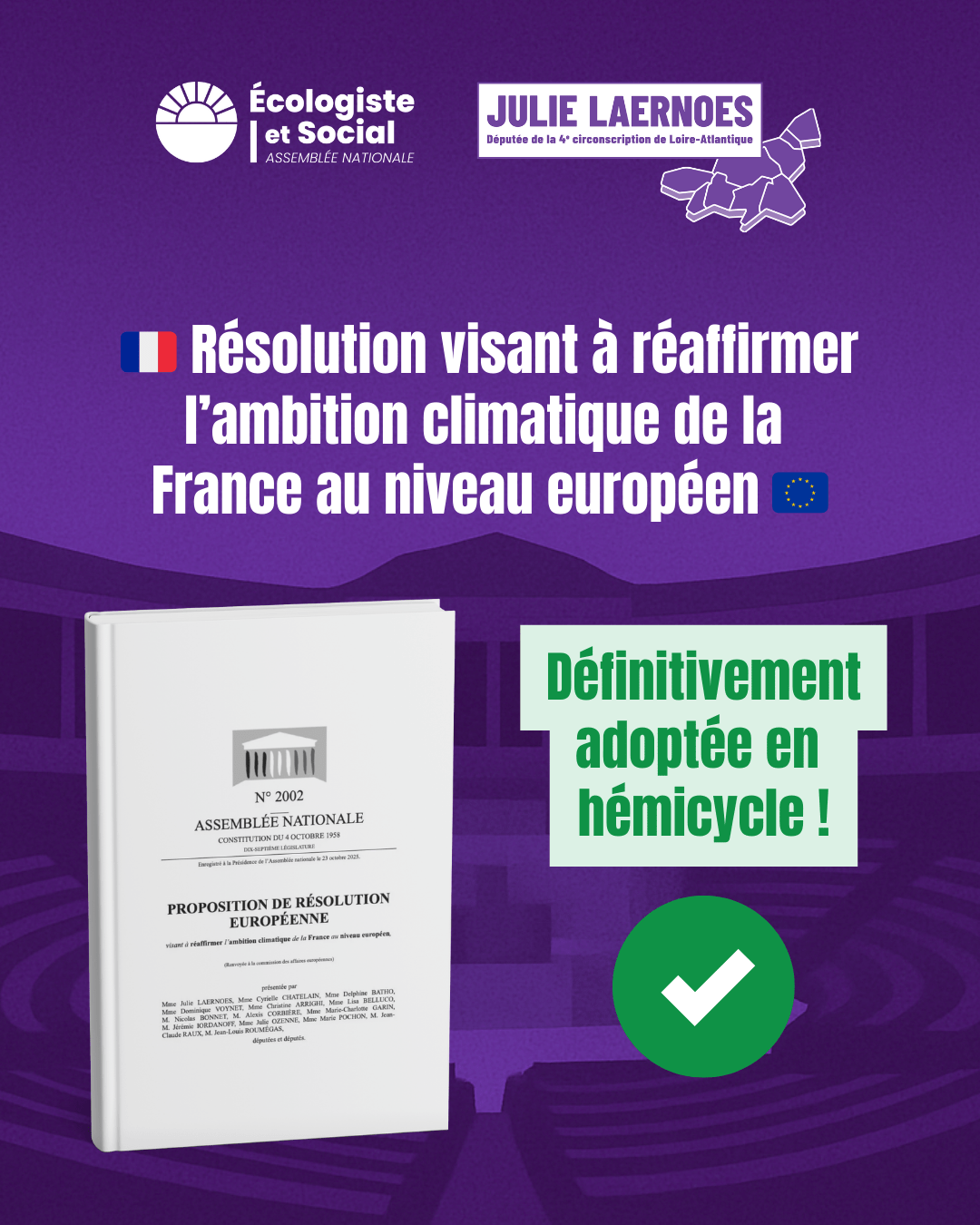 Adoption définitive à l’Assemblée de ma résolution pour réaffirmer notre ambition climatique